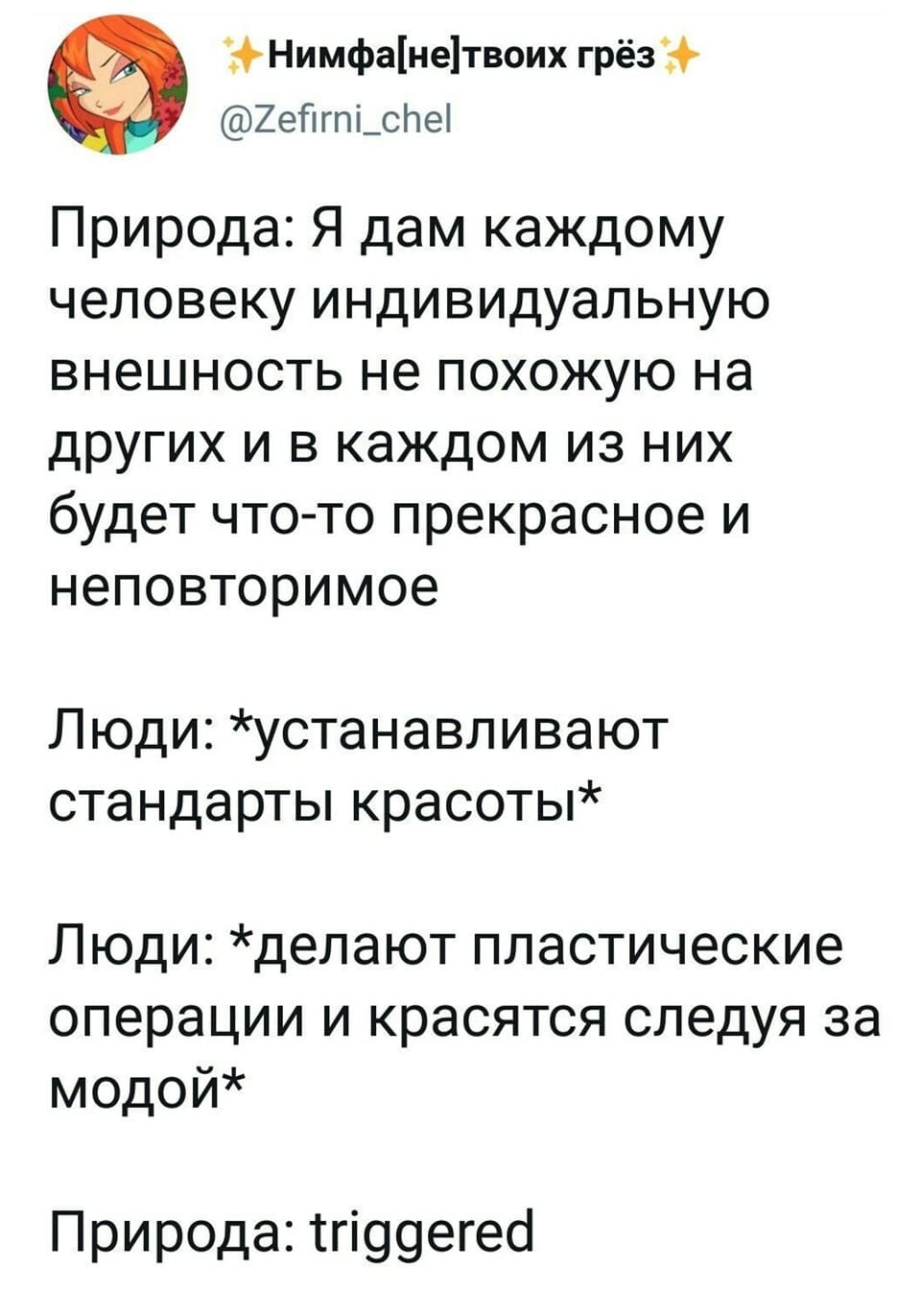 Я вымирающий вид женщин — у меня свои ногти, волосы, брови, ресницы, губы и сиськи.