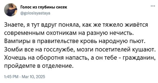 — Зомби-апокалипсис — это когда тебе не дают нормально полежать даже после смерти.