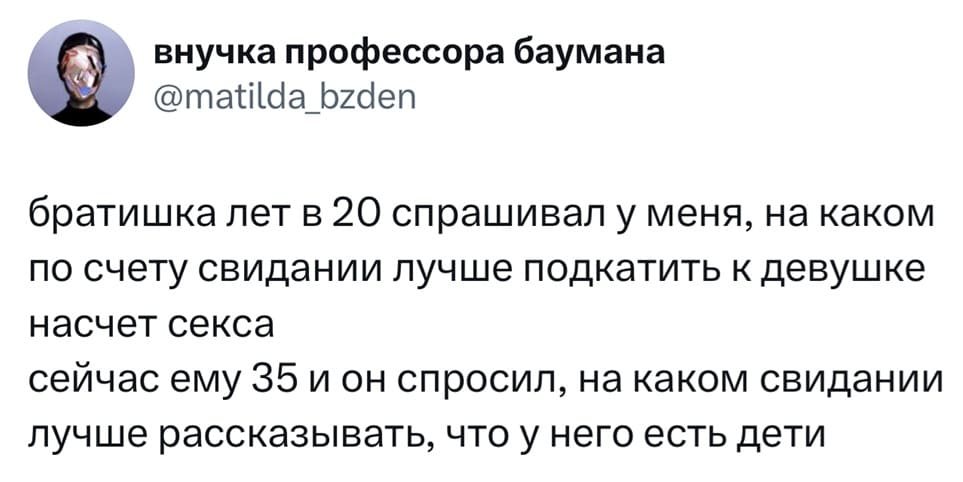 Каждый раз, когда ты отказываешь в свидании хорошему парню, где-то в мире рождается котёнок, который будет жить у тебя после 40 лет.
