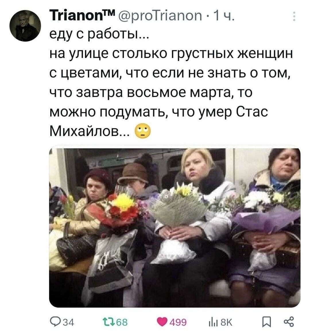 Если видите сегодня девушку с цветами — можете смело знакомиться, ведь цветы у неё, оттого что ее поздравили на работе. Значит, у неё есть работа и она может вас содержать.