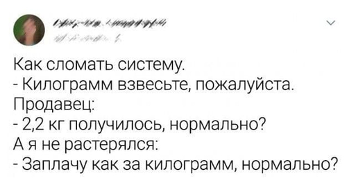 — Понятно, дамочка. А мы алкоголь продаём с двадцати одного года. Отойдите, не мешайте работать. Следующий!