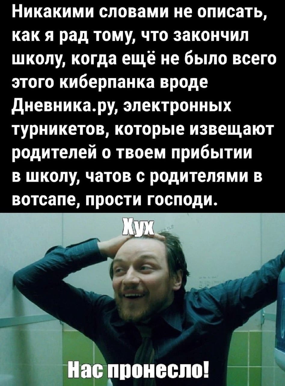 Никакими словами не описать, как сильно я рада тому, что успела закончить школу, когда еще не было всего этого киберпанка вроде дневника.ру, электронных турникетов, которые извещают родителей о твоём прибытии в школу, чатов с учителями и родителями в вотсапе, камерофонов и моды на "АУЕ", прости Господи...