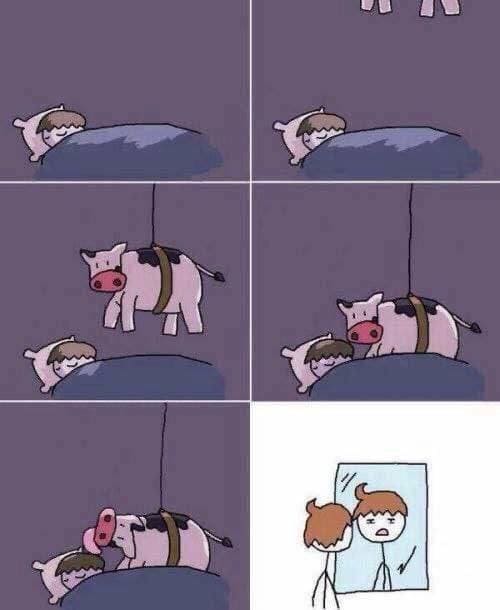 Корова идёт на встречу со своими друзьями — другими коровами в кафе, но когда она приходит, то видит, что все они дружно подпрыгивают на одном месте.