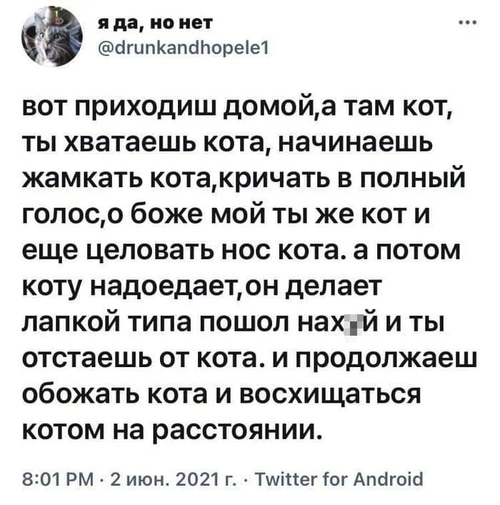 Стою на кухне и глядя на своего кота, начинаю ему мяукать. Кот смотрит на меня и просто охреневает от того, что я умудрился сделать 10 грамматических ошибок в одном "Мяу".