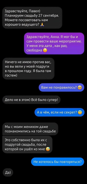 — Брачную ночь не обещаю, но брачные минут 15 будут.