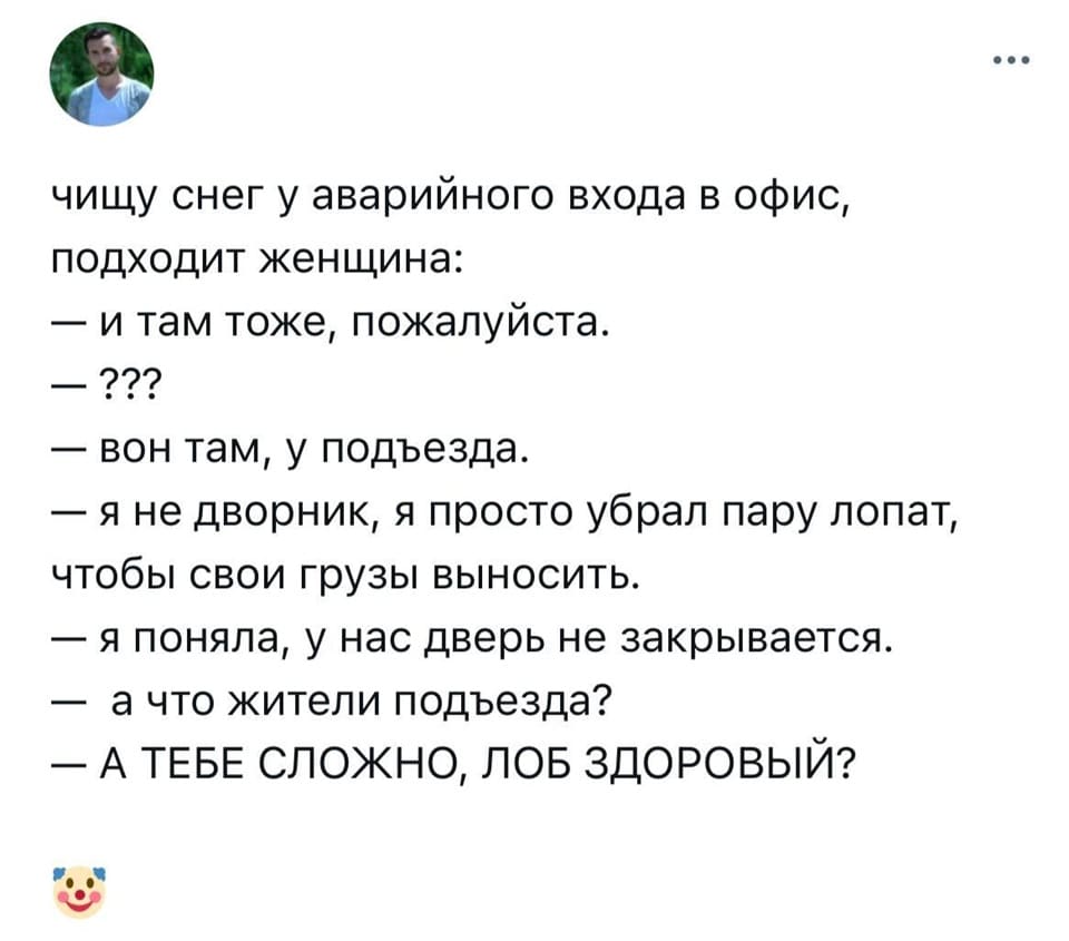 Недавно переехали в новую, более просторную квартиру. Как въехали, обратил внимание на нашего соседа, как только выпадает снег, он - пожилой уже дедок, начинает ворчать и ругаться. Думал, это у него организм так влияет на погодные условия (ревматизм), а оказалось он у нас дворником во дворе работает.