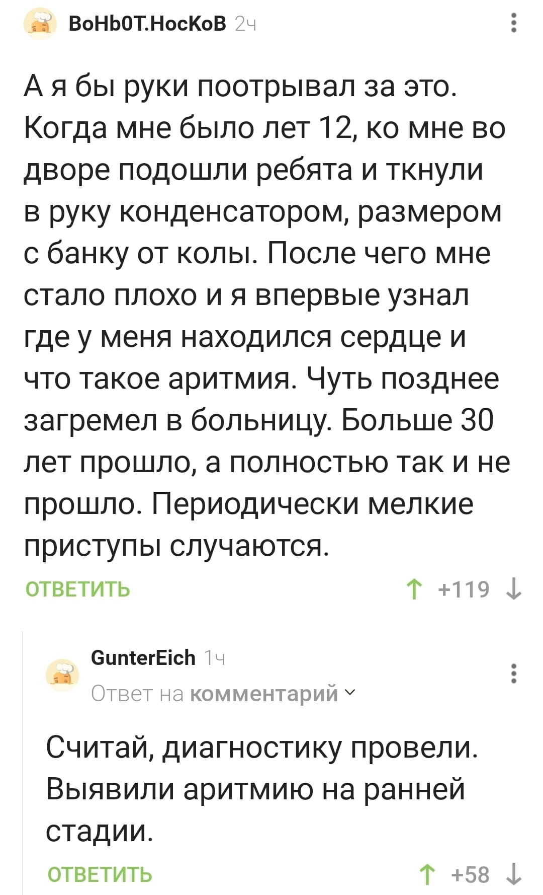 – А я бы руки поотрывал за это. Когда мне было лет 12, ко мне во дворе подошли ребята и ткнули в руку конденсатором, размером с банку от колы. После чего мне стало плохо и я впервые узнал где у меня находился сердце и что такое аритмия. Чуть позднее загремел в больницу. Больше 30 лет прошло, а полностью так и не прошло. Периодически мелкие приступы случаются.