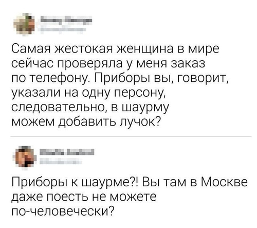 — Я там на днях такую же шаурму купил. Мне одного рулона не хватило...