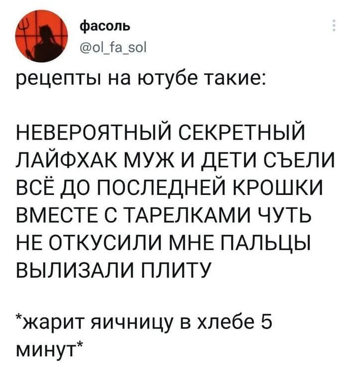 Мой муж профессиональный повар и многие подруги считают, что мне с этим крупно повезло. Как бы не так! На всё, что я приготовлю, я слышу примерно такой комментарии: ой, я бы сюда добавил жопу совы, глаз кабана и тёртый хвост единорога...