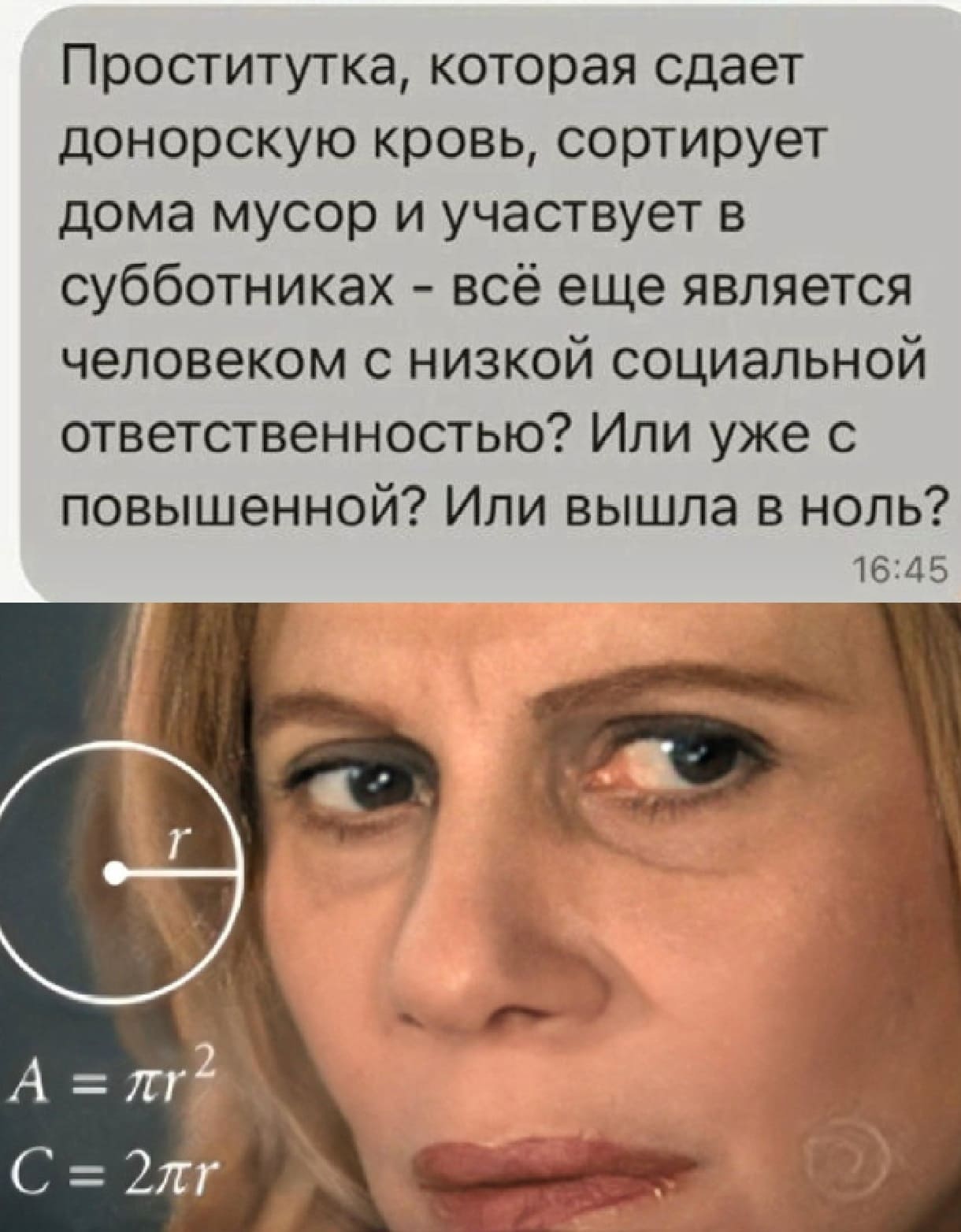 Пpocтитутка, которая сдаёт донорскую кровь, сортирует дома мусор и участвует в субботниках — всё ещё является человеком с низкой социальной ответственностью? Или уже с повышенной? Или вышла в ноль?