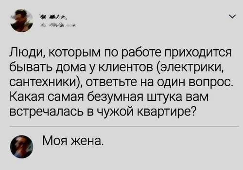 Хозяйке на заметку. Чтобы перебить запах перегара от сантехника, попросите его разуться.