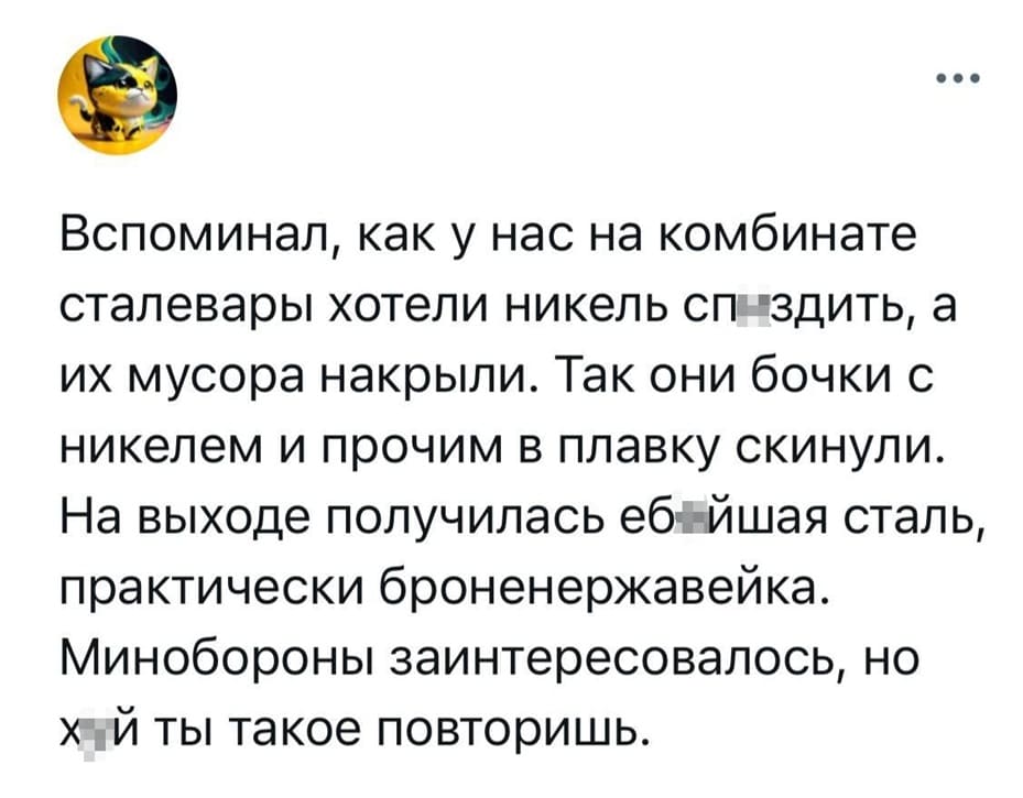 Иностранная делегация посетила советский завод. Мастер и рабочий темпераментно беседуют, никого не замечая. Один из иностранцев знает русский и переводит беседу остальным: «Мастер предлагает рабочему обработать деталь, ссылаясь на то, что он состоит в интимных отношениях с матерью рабочего. Рабочий отказывается обрабатывать деталь, ссылаясь на то, что он состоит в интимных отношениях с матерью мастера, с начальником цеха, с директором завода и с самой деталью».