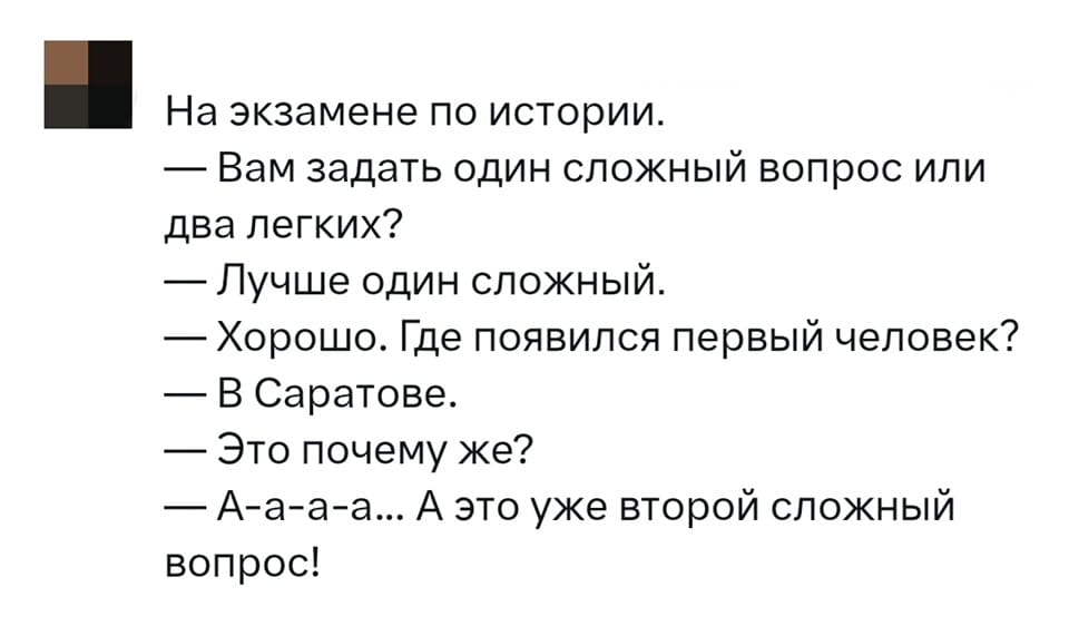 — Давайте, я Вам задам вопрос – если ответите, я иду на пересдачу, если нет — получаю 3.