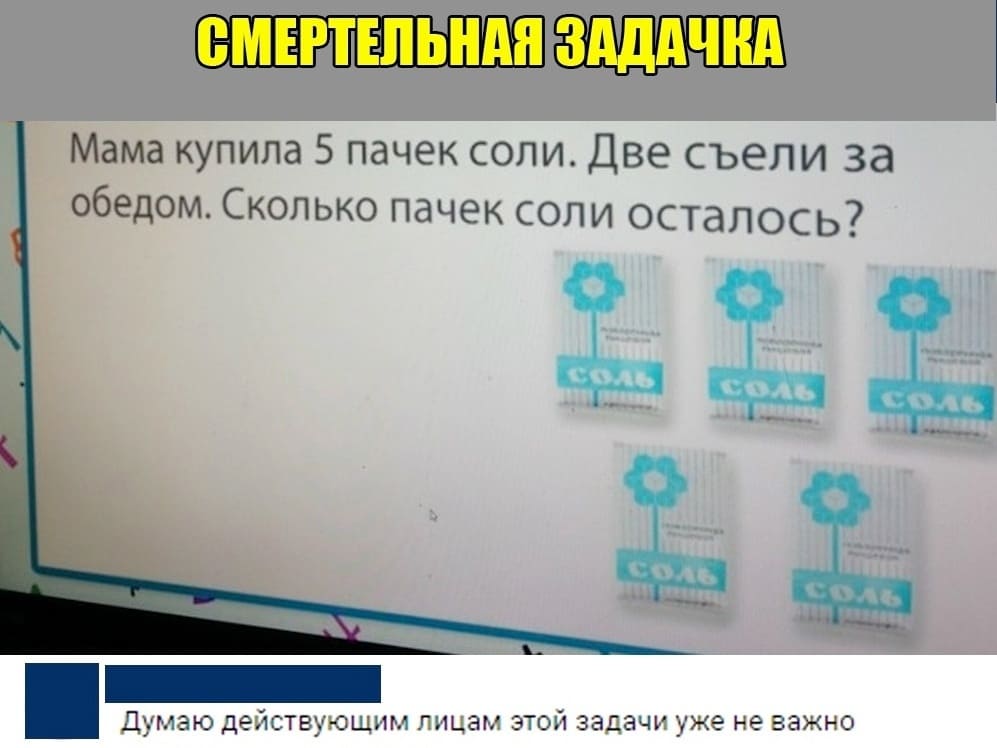 Задача: Мама купила 5 пачек соли. Две съели за обедом. Сколько пачек соли осталось?