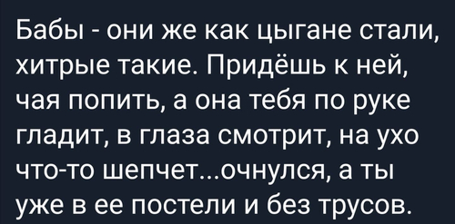 — Да ты что, милая, с ума сошла что ли?!.. Я несу ведро с наковальней, двух кур и гуся. Как я тебя прижму, куда-нибудь, если у меня все руки заняты???