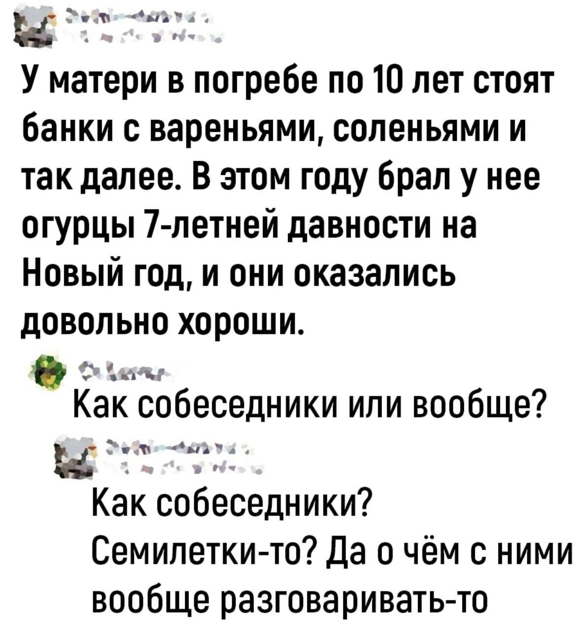 — Если опять зайдёт, скажи ему, что огурчиков больше нет.