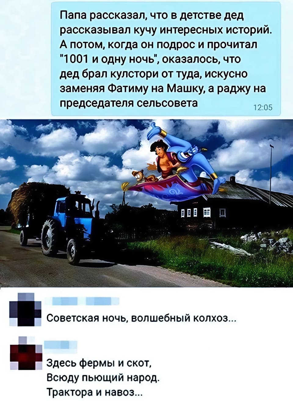 — Дед, внуки звонили, сказали, что не смогут на выходных помочь с огородом — очень устали на работе. Просили передать что-нибудь вкусненькое с дачи.