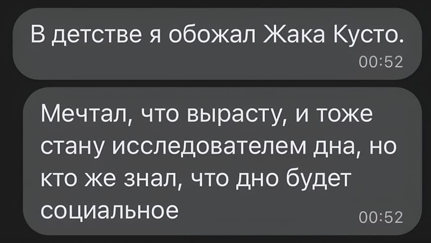 Когда я был совсем ещё мелким ребёнком, я на полном серьёзе думал, что в подвале нашей хрущёвки живут бездомные бомжи. И когда мне, в очередной раз, сильно не хотелось есть мамины щи, то я в тайне от неё выливал содержимое своей тарелки в туалет, имея благие намерения: "Я есть эти щи не хочу, а они там наверное голодные сидят".