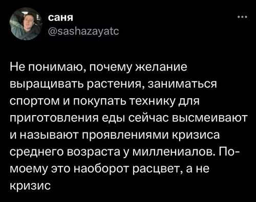 Мой психологический возраст — девяностолетняя бабка, у которой то давление подскочет, то спину перекосит, и ещё я не люблю сосущиеся парочки в людных местах, и вообще, где моя скидка в пятёрочке, почему всё такое дорогое!