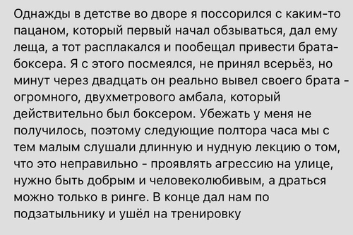 Прогулка в детском саду. Зима. Один из мальчишек громко заявляет: «А папа сказал, что у умных язык к железу не прилипает!» И мы дружно всей группой лизнули: кто — железную горку, кто — перила... Не помню, сразу ли пришло осознание, или когда язык зажил, или ещё позже. Но теперь я точно знаю: у умных, да, не прилипает.