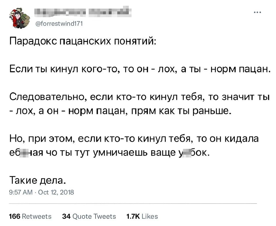 - Уже целый месяц хожу в куртке с рваным рукавом и каждый раз, когда кто-то замечает дырку на моём рукаве, я тут же делаю вид, что "Упс, блин!", мол только что порвалась, какая неприятная неожиданность".