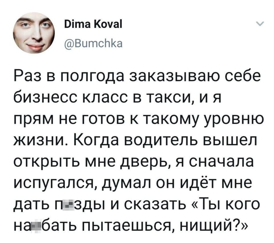 — Ну смотрите. У нас безлимит за 100 рублей. При безлимите ограничена скорость – 10 км/ч. Вы просили ехать побыстрее. Это вам стоило дополнительные 100 рублей за каждые 10 км/ч. Кроме того, безлимит у нас действует только в пределах района. Вы заказали поездку в соседний район, а это уже внутригородской роуминг. Выезд за пределы домашнего района стоит 300 рублей. Более того, во внутригородском роуминге у нас начинается оплата по километрам и мы списываем сумму сразу за 100 километров, это еще 1000. Что значит «дорого»? Обычный тариф у нас 15 руб/км, а тут получается 10. Дешевле же! Кроме того, вы разделили наше такси с друзьями. С 1 января эта услуга платная – дополнительные 200 рублей с человека. И еще 400 рублей мы сняли с вас за прослушивание музыки, т. к. садясь в такси, вы выразили согласие на получение платного музыкального контента. Так что все верно, с вас 2700!