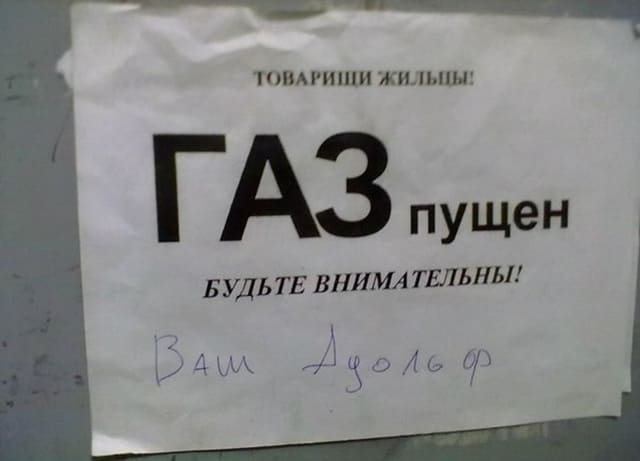 Бежит немецкий офицер по концлагерю. Подбегает к одной из газовых камер, она уже закрывается, он ногой дверь придерживает и спрашивает тех, кто внутри:
