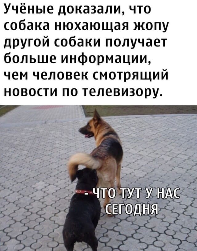 Учёные доказали, что собака нюхающая жопу другой собаки получит больше информации, чем человек смотрящий новости по телевизору.