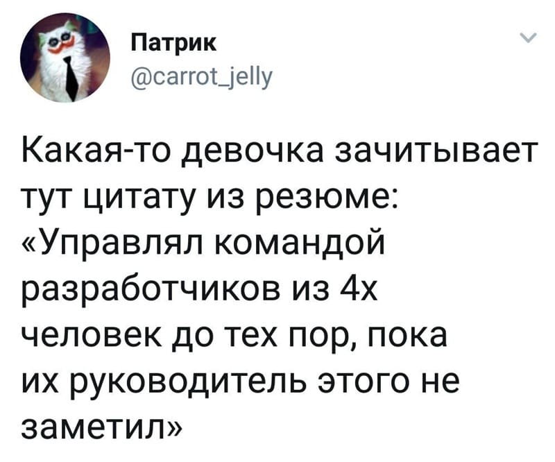 — Вы главное увольте меня, а с таким резюме я уж работу себе точно найду!
