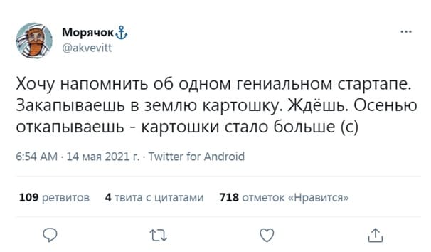 — Дед, внуки звонили, сказали, что не смогут на выходных помочь с огородом — очень устали на работе. Просили передать что-нибудь вкусненькое с дачи.