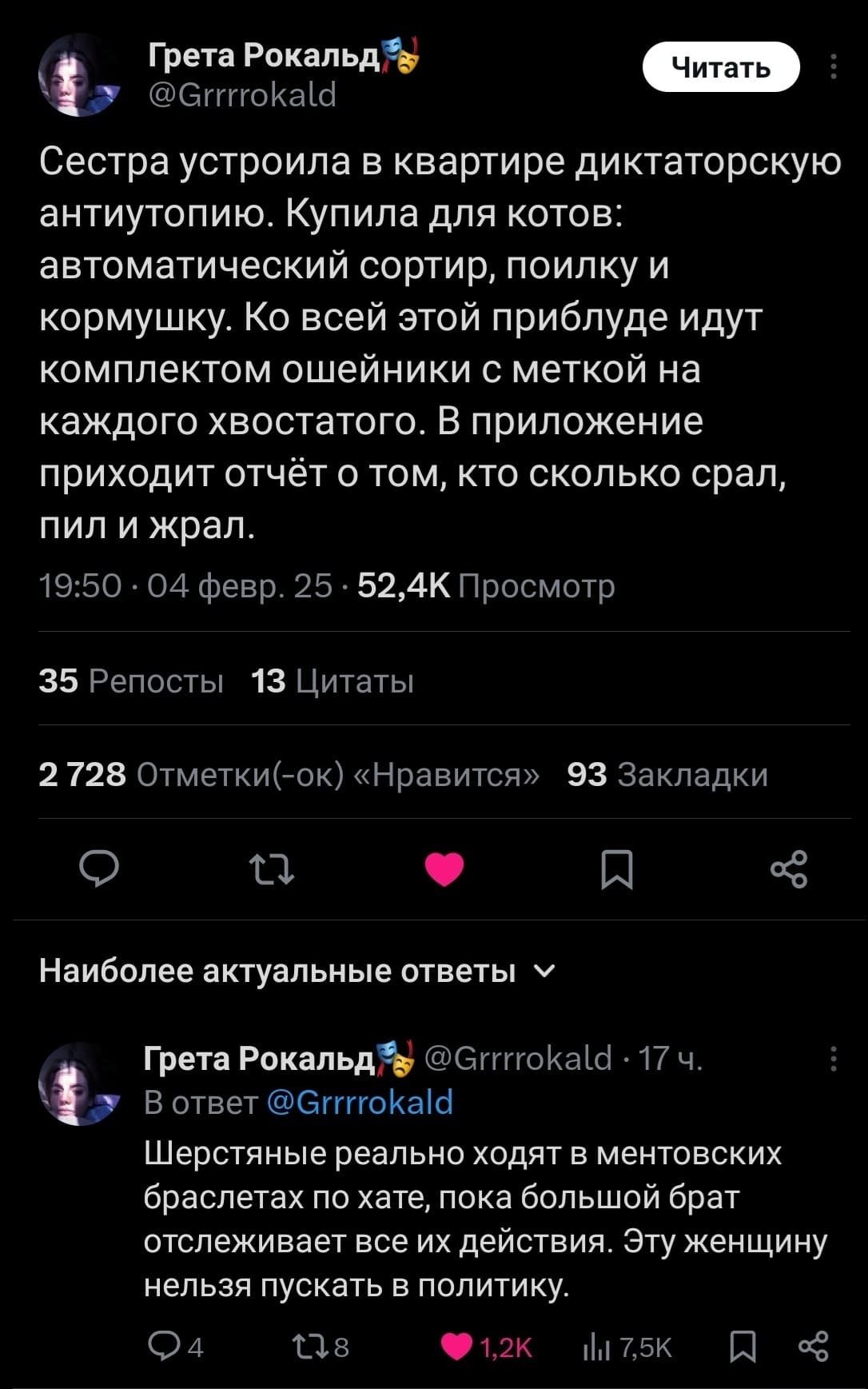 – Сестра устроила в квартире диктаторскую антиутопию. Купила для котов: автоматический сортир, поилку и кормушку. Ко всей этой приблуде идут комплектом ошейники с меткой на каждого хвостатого. В приложение приходит отчёт о том, кто сколько срал, пил и жрал.