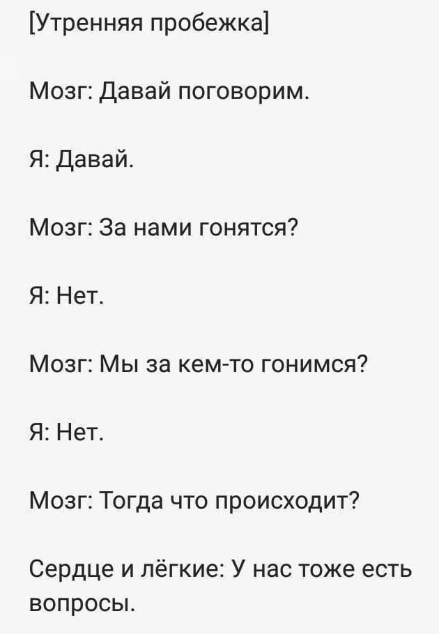 Люди, которые бегают каждое утро, скажите, куда вы так бежите? Ведь бары уже закрыты, магазины ещё закрыты. Так куда?