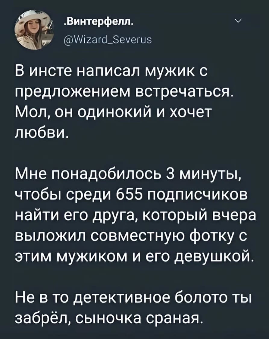 Обожаю вот эту трансформацию от «Привет, ты такая классная» до «Чё молчишь, шлюха», когда не отвечаешь незнакомцам.