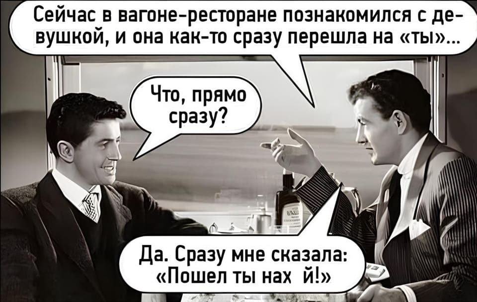— Пожрать? Ты серьезно? Этот текст был написан исходя из Ваших (мужских понтов) попытаться затащить в самый дорогой ресторан (показать свои понты). И кто за чей счёт пожрать хочет это ещё вопрос. Ничего, что меня тут один пригласил в дорогое место, где нажрал кувшин вискаря, лангустины, и молекулярную кухню, после чего вышел якобы позвонить... И кому пришлось платить как бы ты думал? Поэтому место встречи выбираю я. И это явно не дорогие рестораны. А например вокзал города. Чай в столовой. Или это мелко для размышления нынешних мужчин?