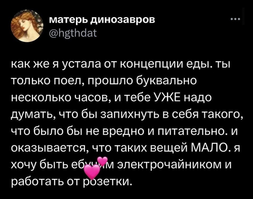 Прикольно, если бы с едой было как с сексом: захотел кушать — включил видео как другие едят, подёргал себя за язык и сытый.