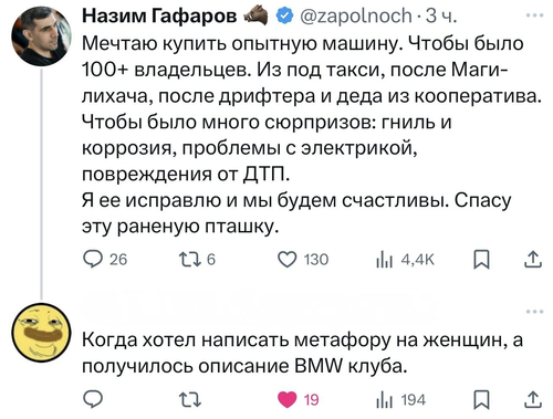 Читаю объявления: «Девушка ездила только на работу, поэтому пробег 7 000 за 4 года»...