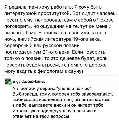 А я за легализацию проституции. Работа ответственная, а там одни самоучки. И без медосмотров.