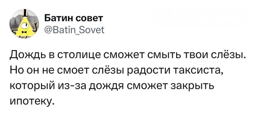 — Опять вышел из дома без зонта и вот полюбуйся, этот ливень теперь уже не скоро закончится...