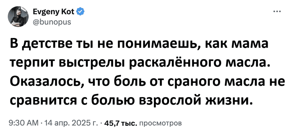 Будучи малолетним ребёнком, я искренне не понимал, почему раскалённое подсолнечное масло, постоянно стреляет в меня во время готовки, а во взрослых — нет. С тех пор прошло уже много лет и теперь я понимаю, что в них тоже стреляет, просто взрослым совершенно пофиг на эту боль от пары капель раскалённого масла в сравнении с экзистенциальным кризисом.