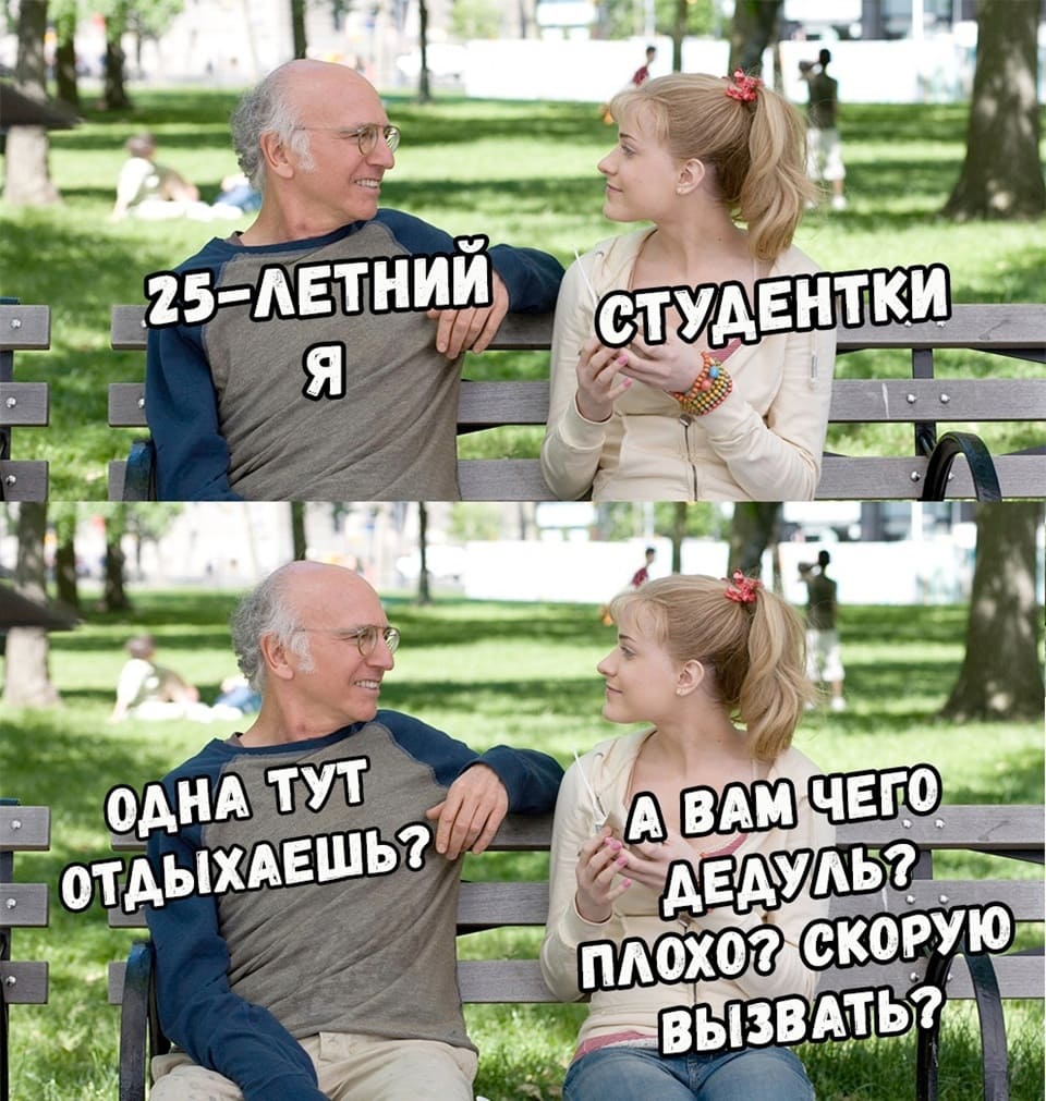 — Ты че, дед обалдел? Ты себя в зеркале видел с такой красавицей рядом?!